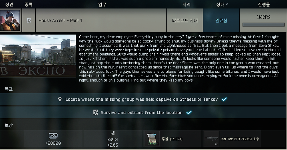 타르코프 퀘스트 - 가택 연금 - 파트 1 (House Arrest - Part 1) 본문