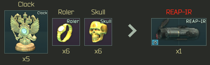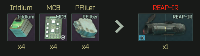 [Trijicon REAP-IR 열화상 조준경]이 2개 필요 합니다. [Trijicon REAP-IR 열화상 조준경]은 메카닉 4레벨 및 스키어 4레벨에 물물교환으로 구할 수 있습니다.