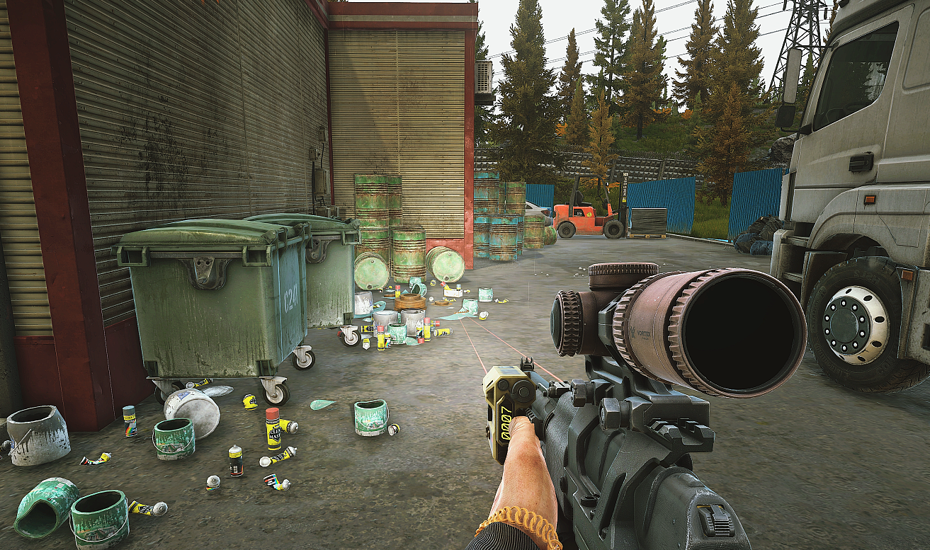 - 세관(Customs) 요새화된 큰 건물 옆 노란색 크레인 아래에 [Trijicon REAP-IR 열화상 조준경]을 숨겨 두세요.