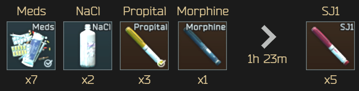 ![]() 하이드아웃(Hideout) 의료 시설 3레벨(Medstation lv. 3)에서 제작 할 수 있습니다. 퀘스트 - 동료들 - 파트 1 (Colleagues - Part 1) 에서 2개 얻을 수 있습니다. |