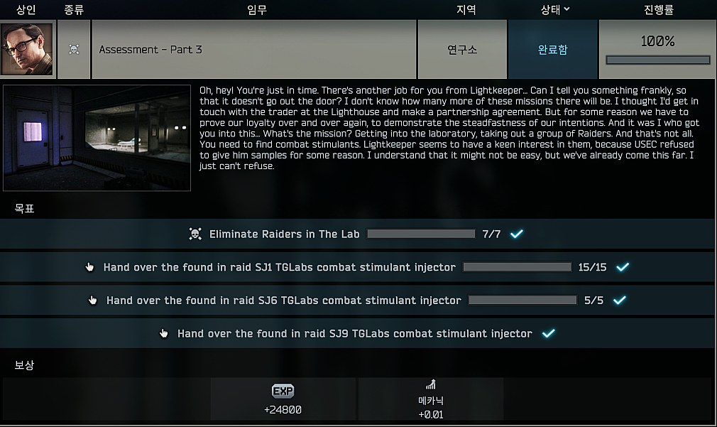 레이드에서 [SJ1 TGLabs 전투 자극제 주사기], [SJ6 TGLabs 전투 자극제 주사기], [SJ9 TGLabs 전투 자극제 주사기]를 구해야 합니다. 죽어서 인레이드 마크(Found in raid mark)가 없어지면 퀘스트로 제출하지 못하기 때문에 구하면 꼭 무사히 탈출하는 것을 목표로 하셔야 합니다.