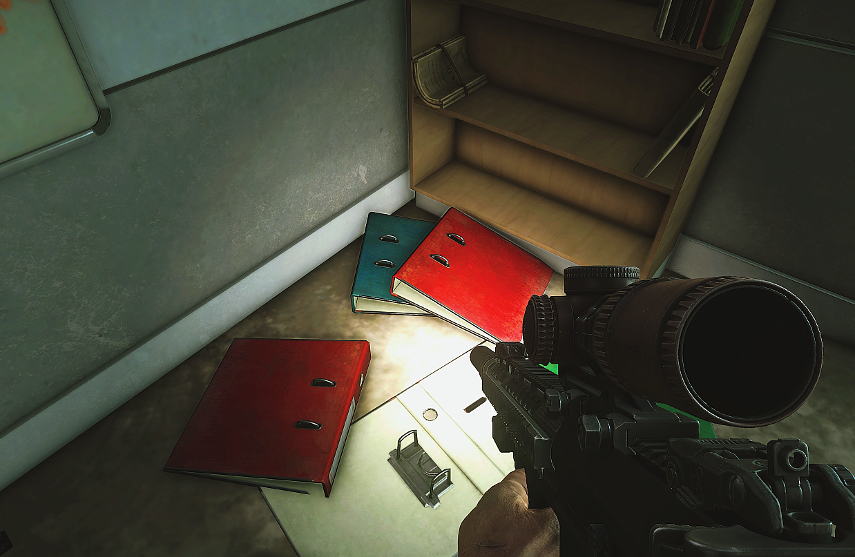 | 문 오른쪽 선반, 파일철 사이 | 오른쪽 모서리 선반, 땅에 떨어진 파일철 아래 |