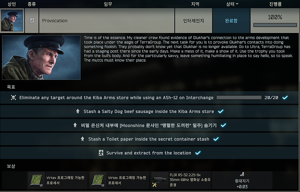 - 인터체인지(Interchange)의 Kiba Arms 상점 근처에서 ASh-12를 사용해서 20명의 아무 타겟을 사살하세요.