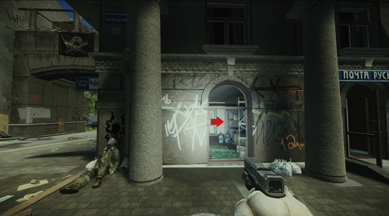 - (타르코프 시내(Streets of Tarkov)) Primorsky에서 영화관이 내려다 보이는 좋은 저격 위치를 찾으세요.
