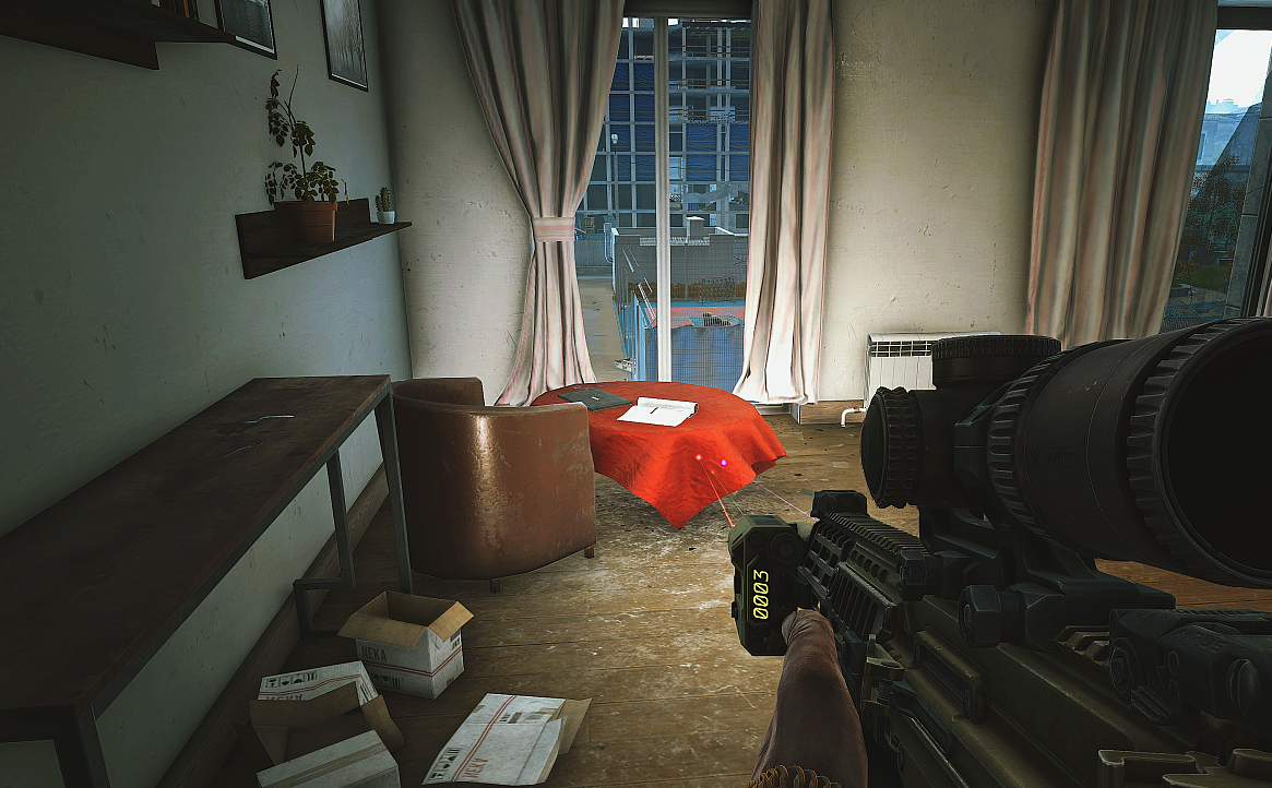 - [AI .338 LM Tactical Sound Moderator]를 붉은 테이블 근처에 숨겨두세요.
