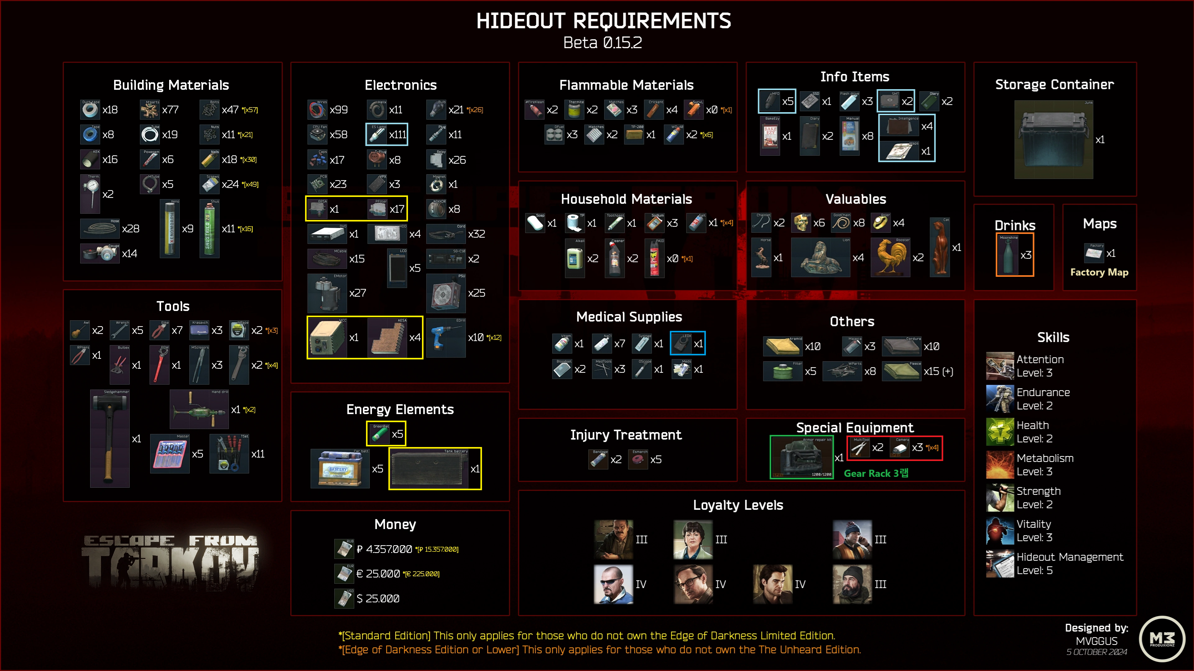타르코프 위키에서 아래와 같이 하이드아웃 요구템이 정리되어 있는데, 그중에서 절대 팔아선 안 되는 아이템을 몇 가지 정리해 드리겠습니다.