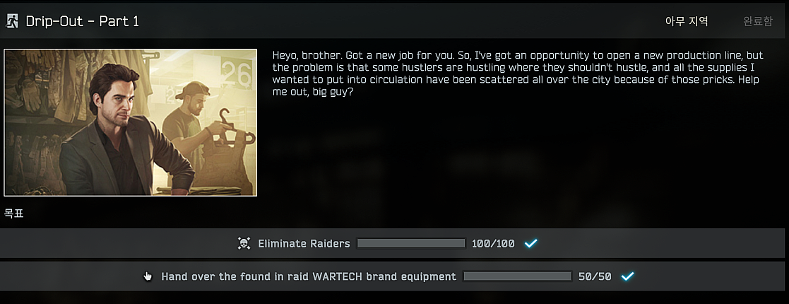 레이드에서 [WARTECH brand] 장비 50개를 구해야 합니다. 죽어서 인레이드 마크(Found in raid mark)가 없어지면 퀘스트로 제출하지 못하기 때문에 구하면 꼭 무사히 탈출하는 것을 목표로 하셔야 합니다.