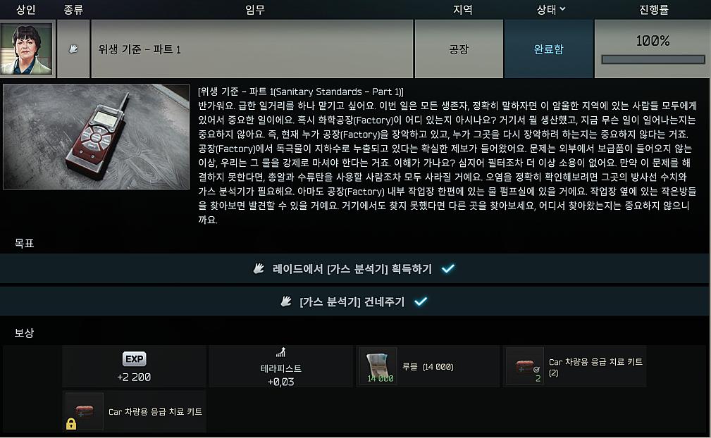 타르코프 퀘스트 - 위생 기준 - 파트 1 (Sanitary Standards - Part 1) 본문