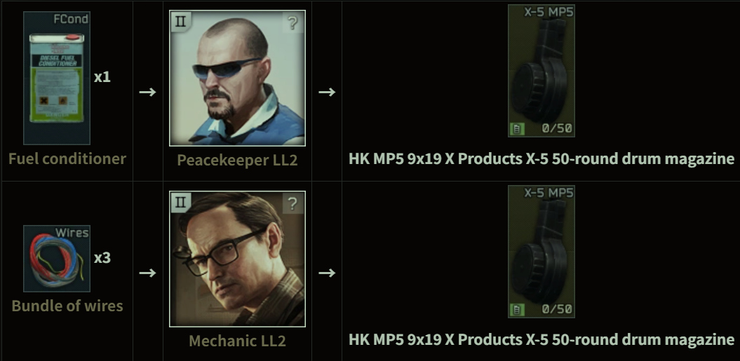 HK MP5 9x19 X Products X-5 50-round drum magazine은 피스키퍼와 메카닉에게서 물물교환으로 구할 수 있습니다.
