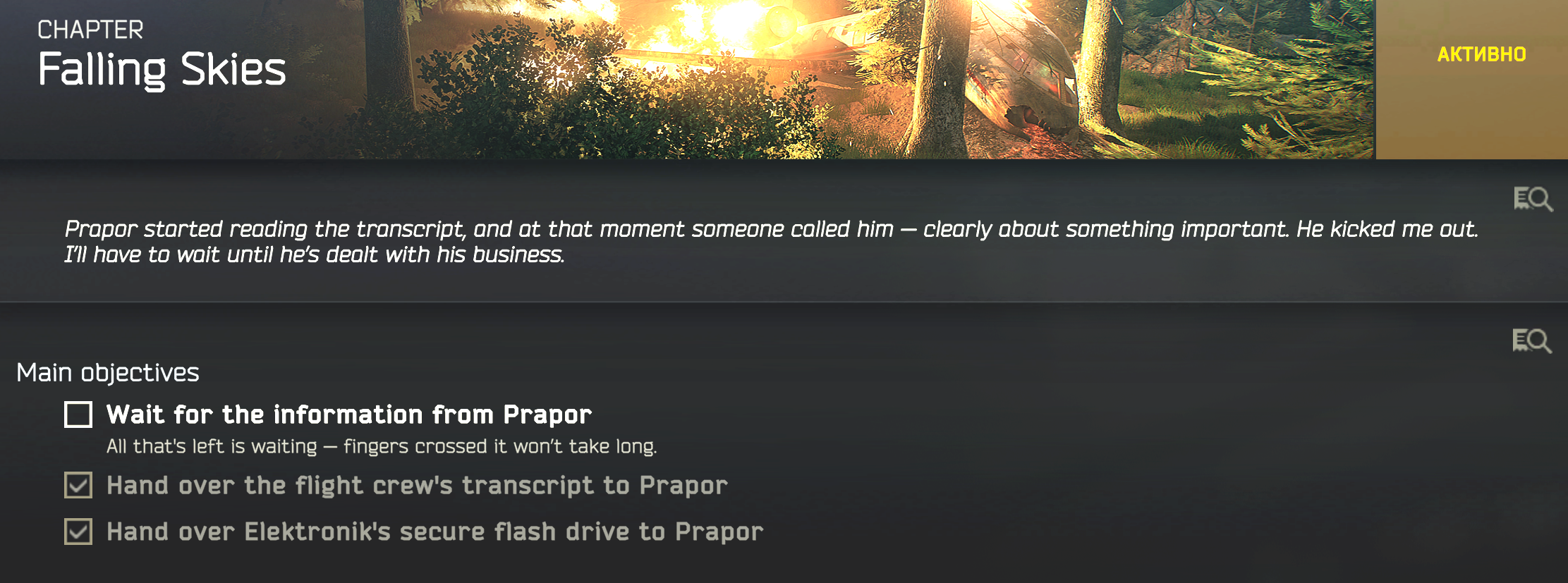 타르코프 퀘스트 - Falling Skies; (Hand over the flight crew's transcript to Prapor)