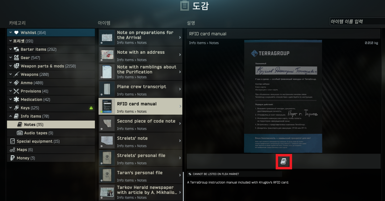 케르만씨와 함께 하게 되면서 가장 먼저는 RFID 공카드(Blank RFID keycard)를 얻어야 하는데 이건 낮은 확률로 스캐브가 가지고 있거나 샤따맨 주머니에서 나온다고 합니다. 처음에는 매우 얻기 어려웠는데 BSG에서 거래가 가능하게 바꿔주어서 플리마켓에서 구매하면 됩니다. 나중에 터미널 맵으로 갈 때 사용합니다.