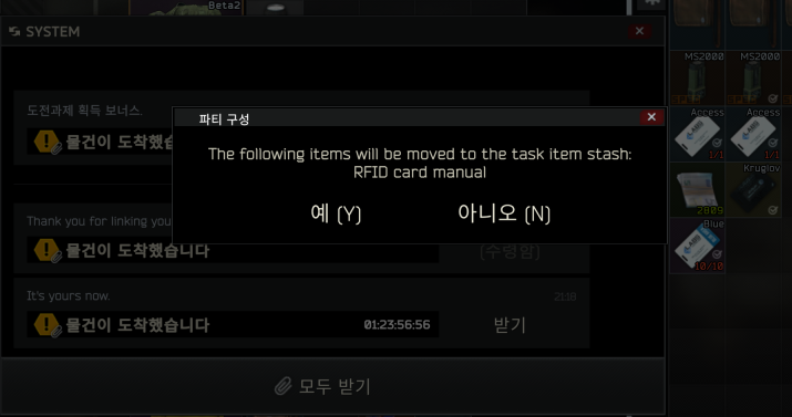 그리고 열고 나면 시스템에서 메시지가 오는데요. 받기를 누르면 RFID card manual을 받을 거냐고 묻습니다.