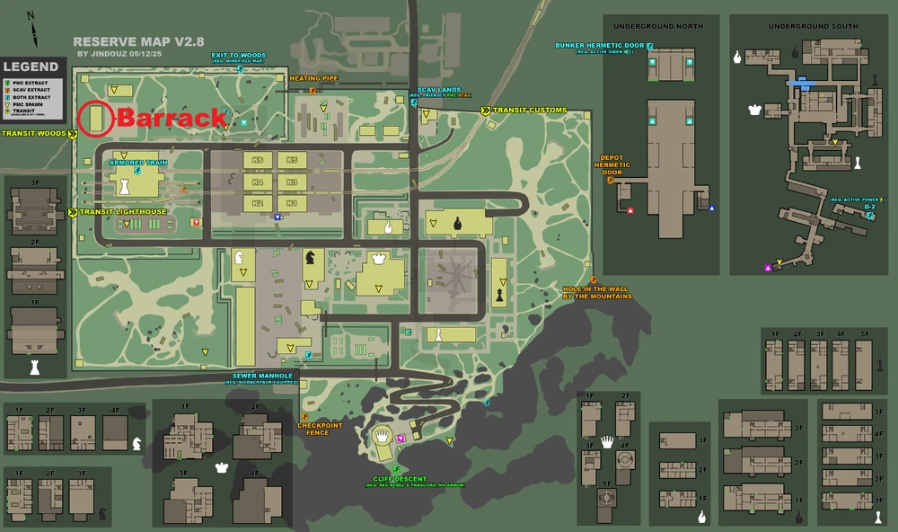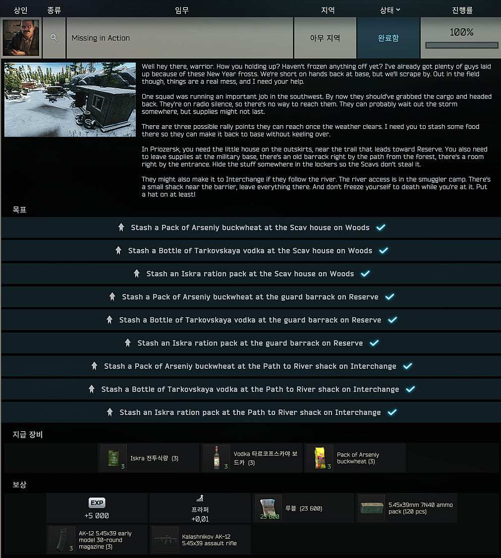 - 리저브(Reserve)의 지정된 장소에 [Iskra 전투식량], [Vodka 타르코프스카야 보드카], [Pack of Arsenly buckwheat]를 숨겨두세요.