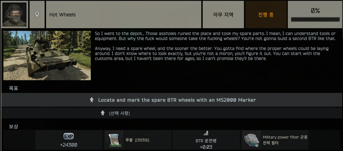 퀘스트 수락은 삼림·우드(Woods) 혹은 스트리트·스오타(Streets of tarkov)의 BTR 드라이버를 만나야 합니다. BTR 드라이버와의 대화를 통해 퀘스트를 받을 수 있습니다.