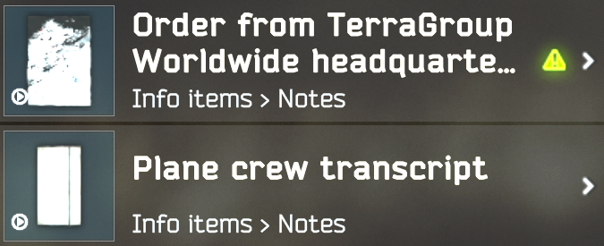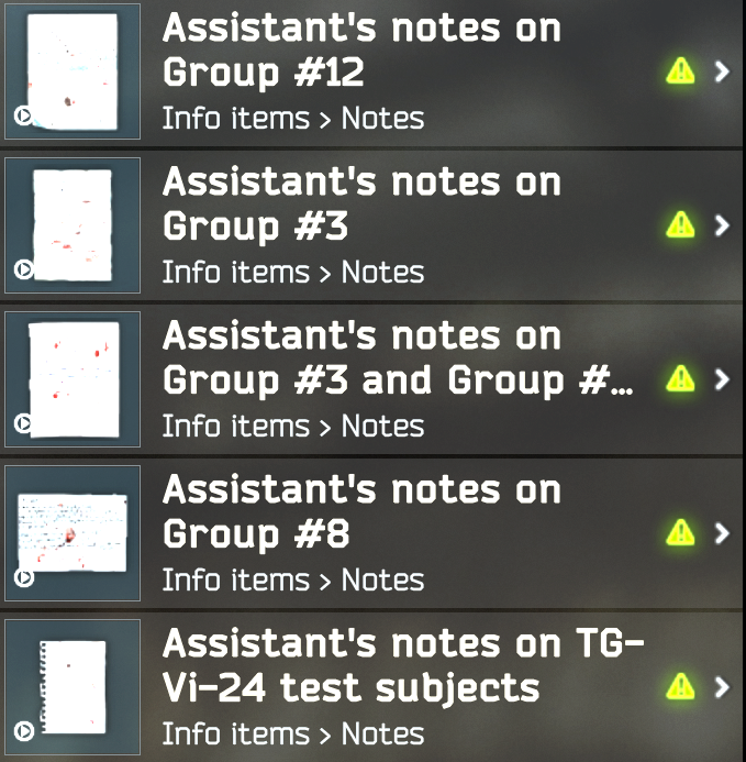 [notes] 27개 Assistant's notes on Group #12 Assistant's notes on Group #3 Assistant's notes on Group #3 and Group #10 Assistant's notes on Group #8 Assitant's notes on TG-Vi-24 test subjects Bogatyr squad operations report Book of the Arrival Cargo transport fax Copy of report for TG Worldwide Document mentioning a protocol Document on changes in enterprise interations FSB report Folder with intelligence on Norvinsk region facilities Hard drive printout Hostage evacuation report from Voevoda Leshy's diary Letter from Kozlov's room Letter from Reshala's bunkhuse Letter from the mailbox Moreman's personal file Note on preparations for Arrival Order from TerraGroup Worldwide headquarters Plan crew transcript Strelet's personal file Taran's personal file Tansport log with notes Voevoda's personal file [tapes] 5개 A.P. meeting audio tape Part 1 A.P. meeting audio tape Part 2 Audio tape with report Cult victim audio tapoe #1 Cult victim audio tapoe #2 |