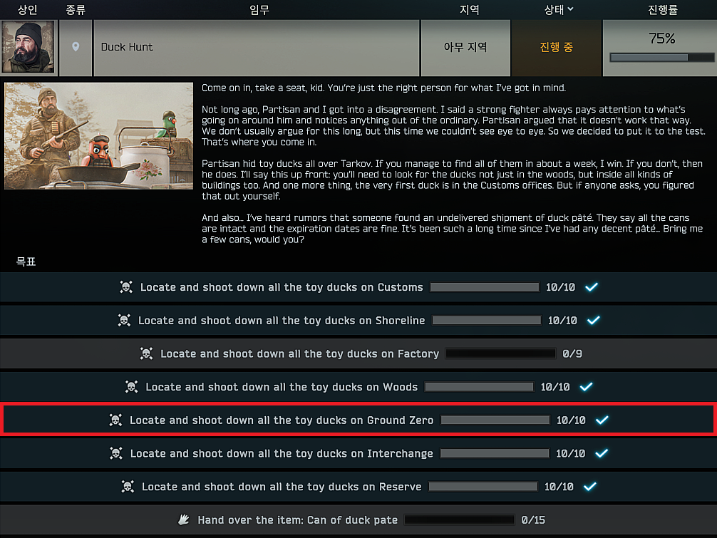 타르코프 퀘스트 - Duck hunt - 그라운드 제로(Ground Zero) 본문
