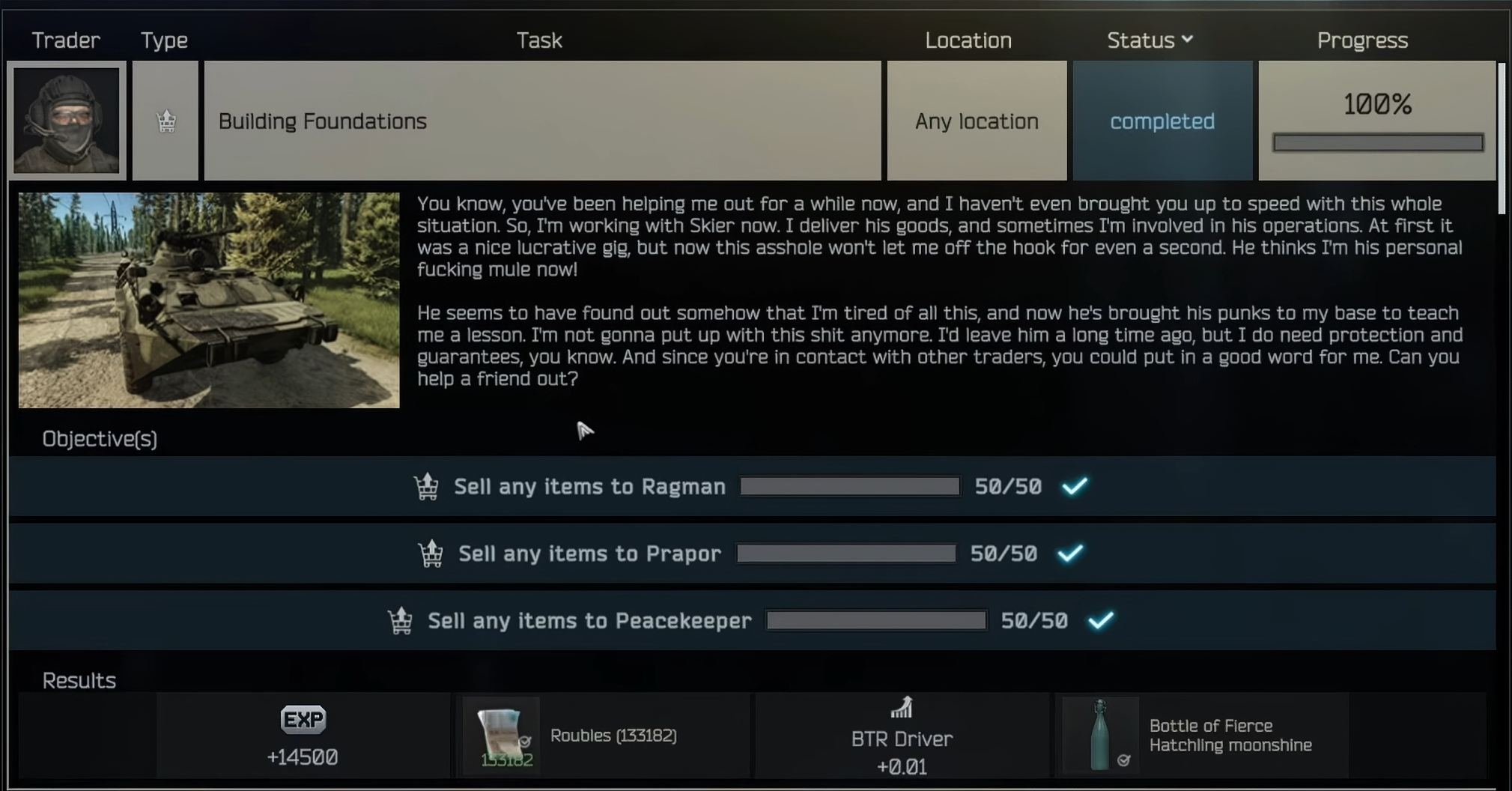 이후 레그맨, 프라퍼, 피스키퍼에게 각각 50개의 아이템을 판매하면 되는 간단한 퀘스트입니다. 단, 탄약류(Ammunition)는 인정되지 않습니다.
