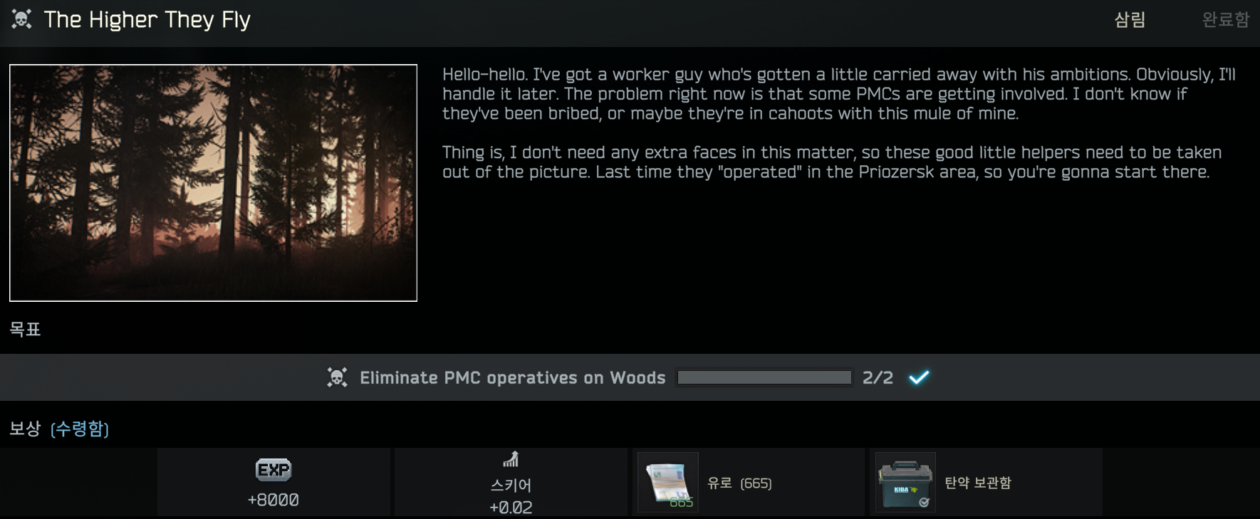 BTR 퀘스트 라인이지만 스키어에게 퀘스트를 받을 수 있습니다. 삼림(우드·Woods)에서 PMC를 2명 잡으면 됩니다.