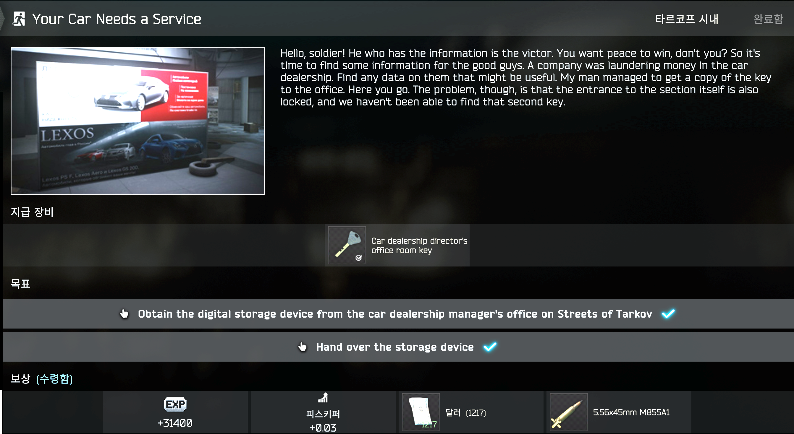 타르코프 퀘스트 - Your Car Needs a Service 본문