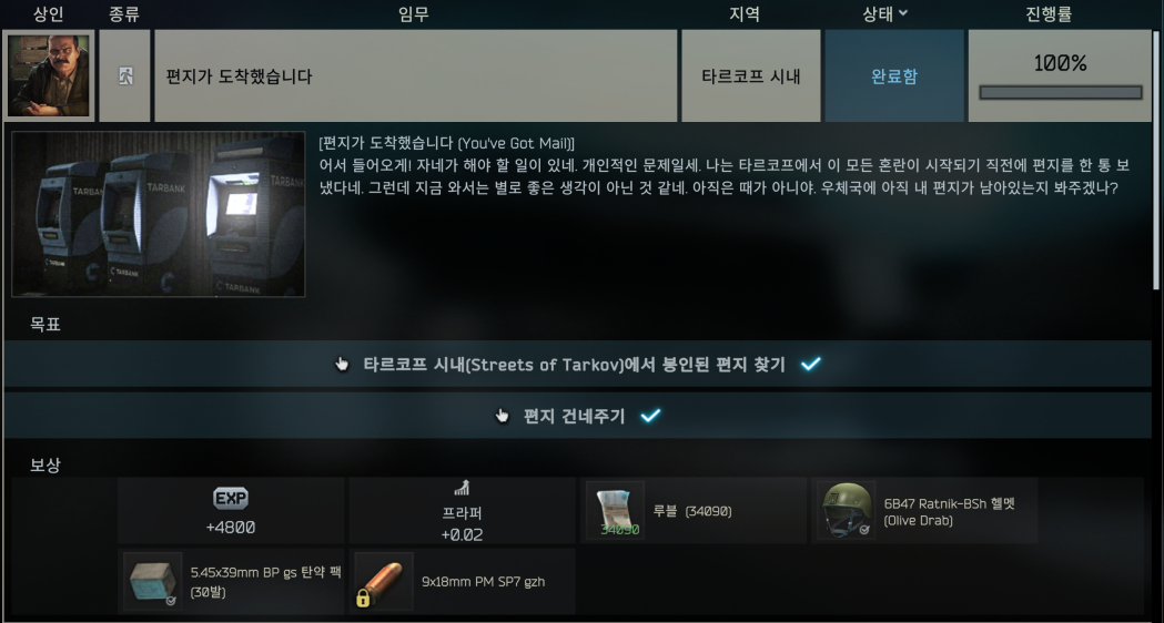 타르코프 시내 중심가에 있는 우체국에서 봉인된 편지(registered mail)를 찾아야 합니다.