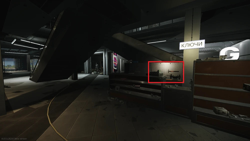 | Klimov 쇼핑몰 정면 모습 | 1층 에스컬레이터 밑 페그보드(타공판)에 블러드키(Rusted bloody key) |