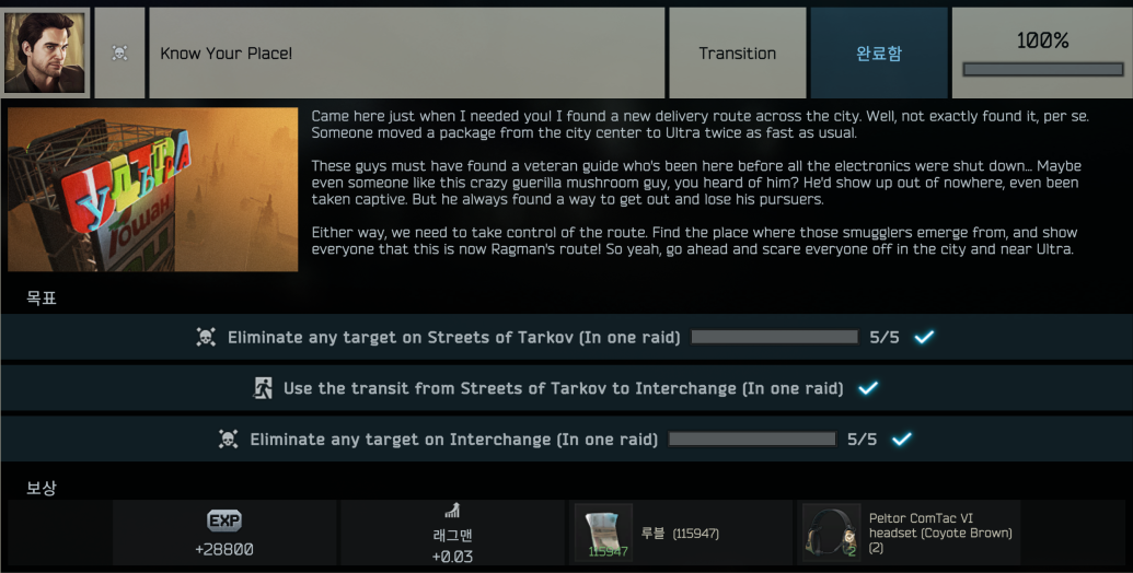 타르코프 시내에서 아무 적이나 5명을 제거한 뒤 인터체인지로 이동 후 동일하게 아무 적이나 5명을 제거 하면 퀘스트 완료 입니다. 인터체인지 이동시 북부 고속도로 근처에서 스폰 합니다. 참고하시고 이동 동선을 고려하시기 바랍니다.