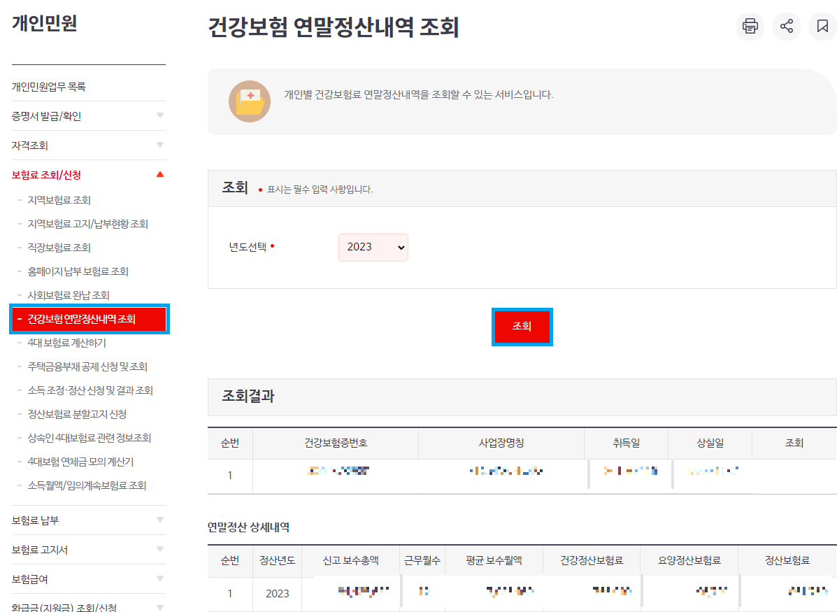 ③ 건강보험 연말정산내역 조회 버튼을 누릅니다.