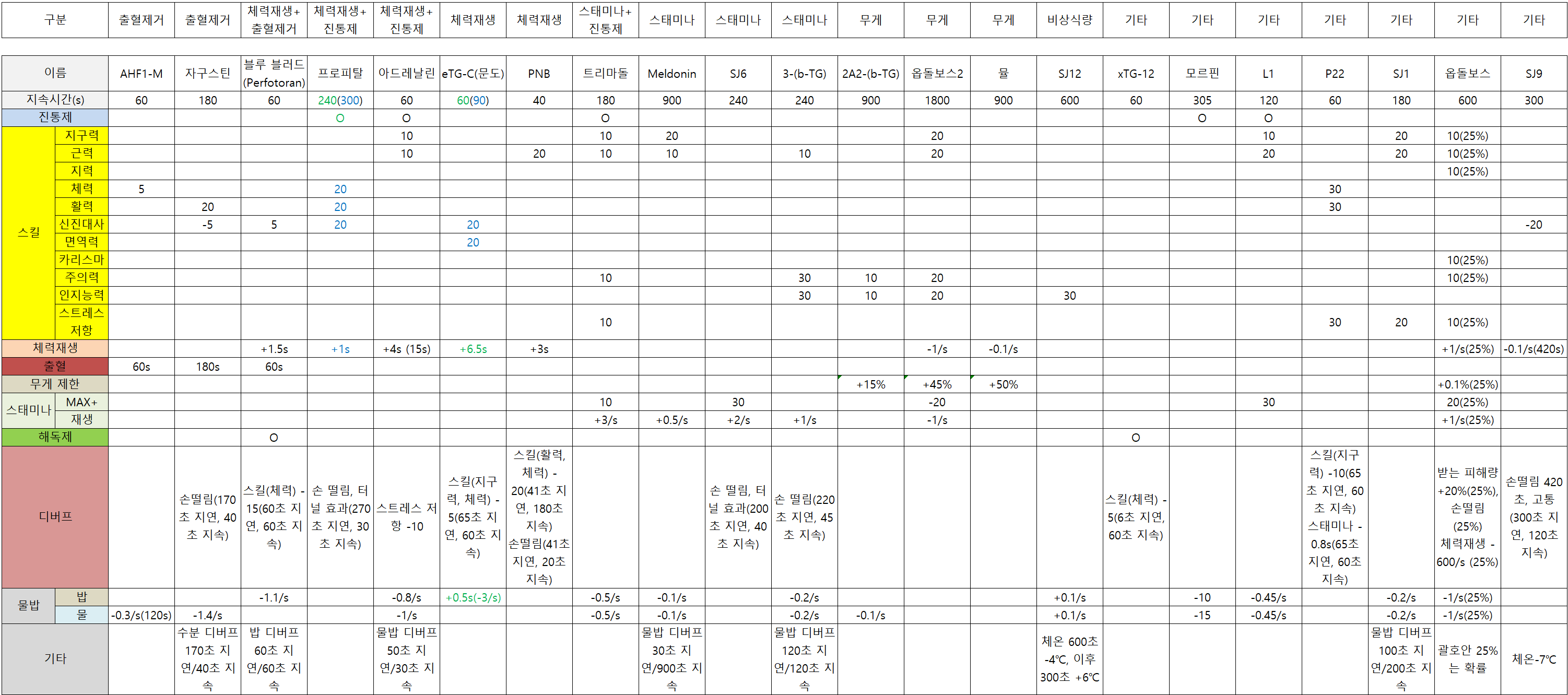 프로피탈(Propital) | +1/s (300s) | 진통제 (240s) | 체력/활력/신진대사 +20 |